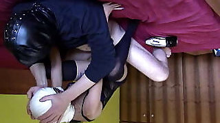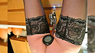 Fuckmachine, nipple clams, buttplug, pantyhose and high heels.