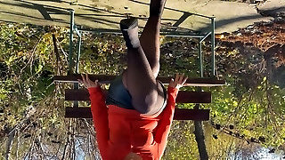 Fabulous horny MILF rubs her pussy under beige pantyhose outdoors