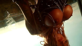 Slut with huge melons in pink fishnet wants to slap a nice backside