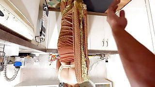Risky jerk off while watching massive ass hijab stepmother in the kitchen.
